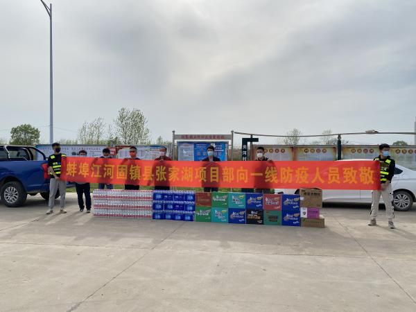 4月9日(ri)固鎮(zhèn)縣(xian)張傢(jia)湖(hu)施(shi)工1標(biāo)慰(wei)問(wen)一(yi)線防疫(yi)人(ren)員(yuan)